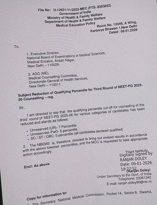 The NEET PG 2025 counseling procedure is now on hold as of January 12, 2026, mostly because of the anticipated modification of the qualifying percentile criteria and the high number of open MD/MS seats following Round 2. A comparable 10–15 percentile reduction is now widely expected, following the established pattern from the previous year when the Ministry of Health and Family Welfare (MoHFW) and the National Medical Commission (NMC) lowered the qualifying percentile to 15th for General/EWS and 10th for reserved categories prior to Round-3. Expanding eligibility, reopening new registrations, and ensuring that unfulfilled postgraduate medical seats are used effectively rather than sitting empty are the goals of this stage.
